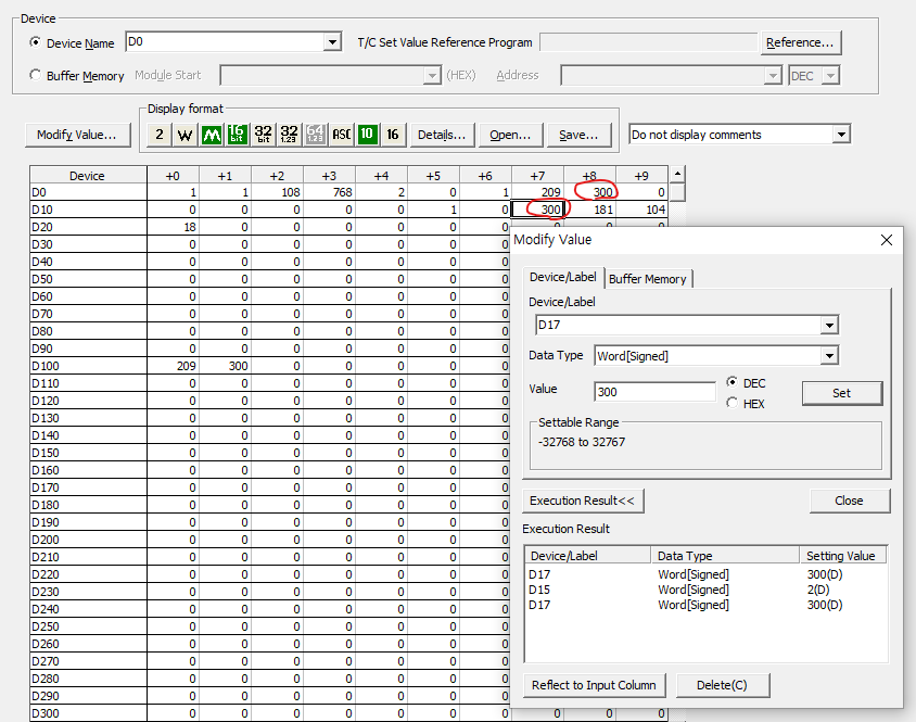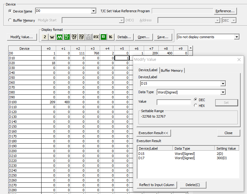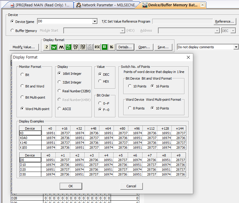 디바이스에 D0영역부터 확인하기 위해 D0를 입력하고 Display format에서 Details에 들어가서 Word Multi-point, 10 Points로 설정하여 보기 편하게 세팅한다.