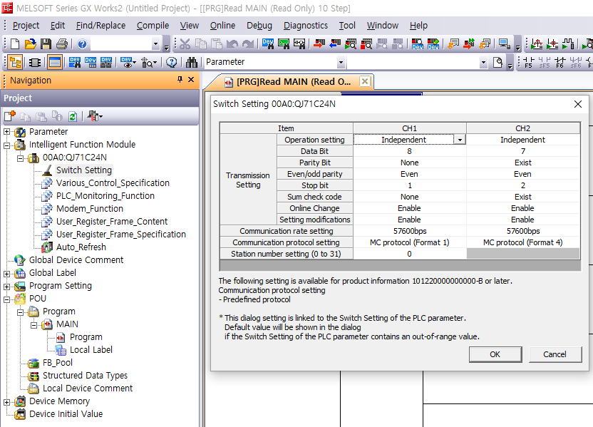 CH2의 세팅을 사진과 같이 설정한다. 특히 통신 프로토콜은 MC protocol(Format 4)로 세팅을 한다. 이후 PLC에 write 하고 동작을 확인해야 한다.