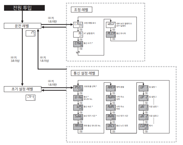 송신 대기 시간은 E5CC가 PLC에서 보낸 응답을 수신한 후 명령을 송신할 때까지의 대기 시간입니다. 권장값은 1이며 송신 타이밍이 너무 빨라 PLC가 수신할 수 없는 경우는 값을 크게 설정해야 한다.